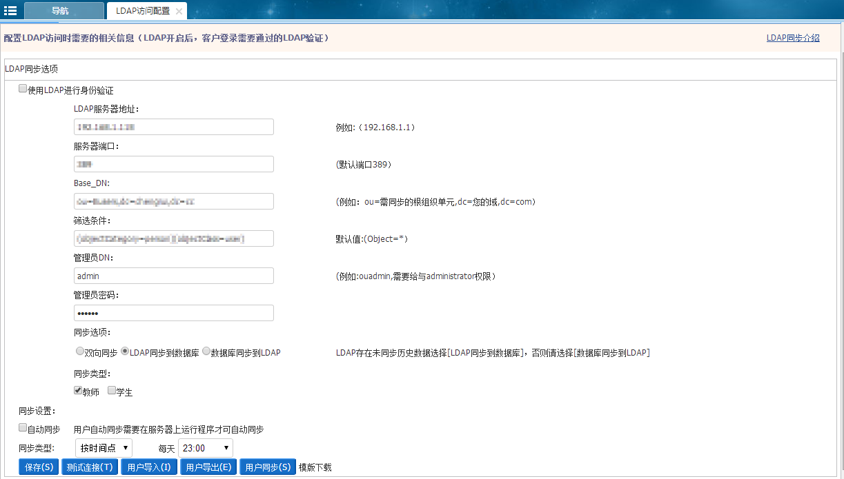 LDAP访问配置:配置LDAP服务器地址、测试服务器链接以及导入数据到服务器,并提供数据库与服务器间数据双向同步等服务。